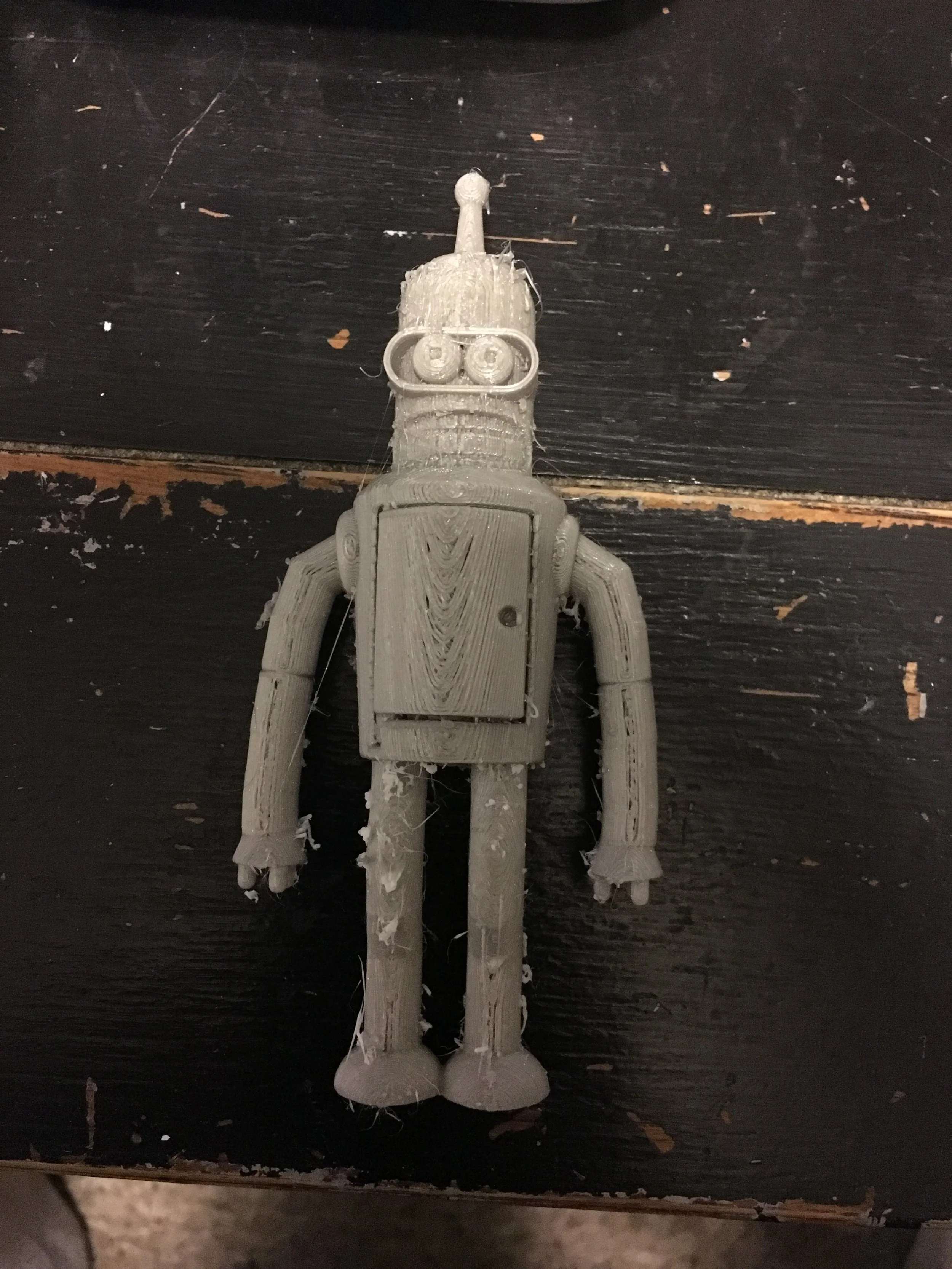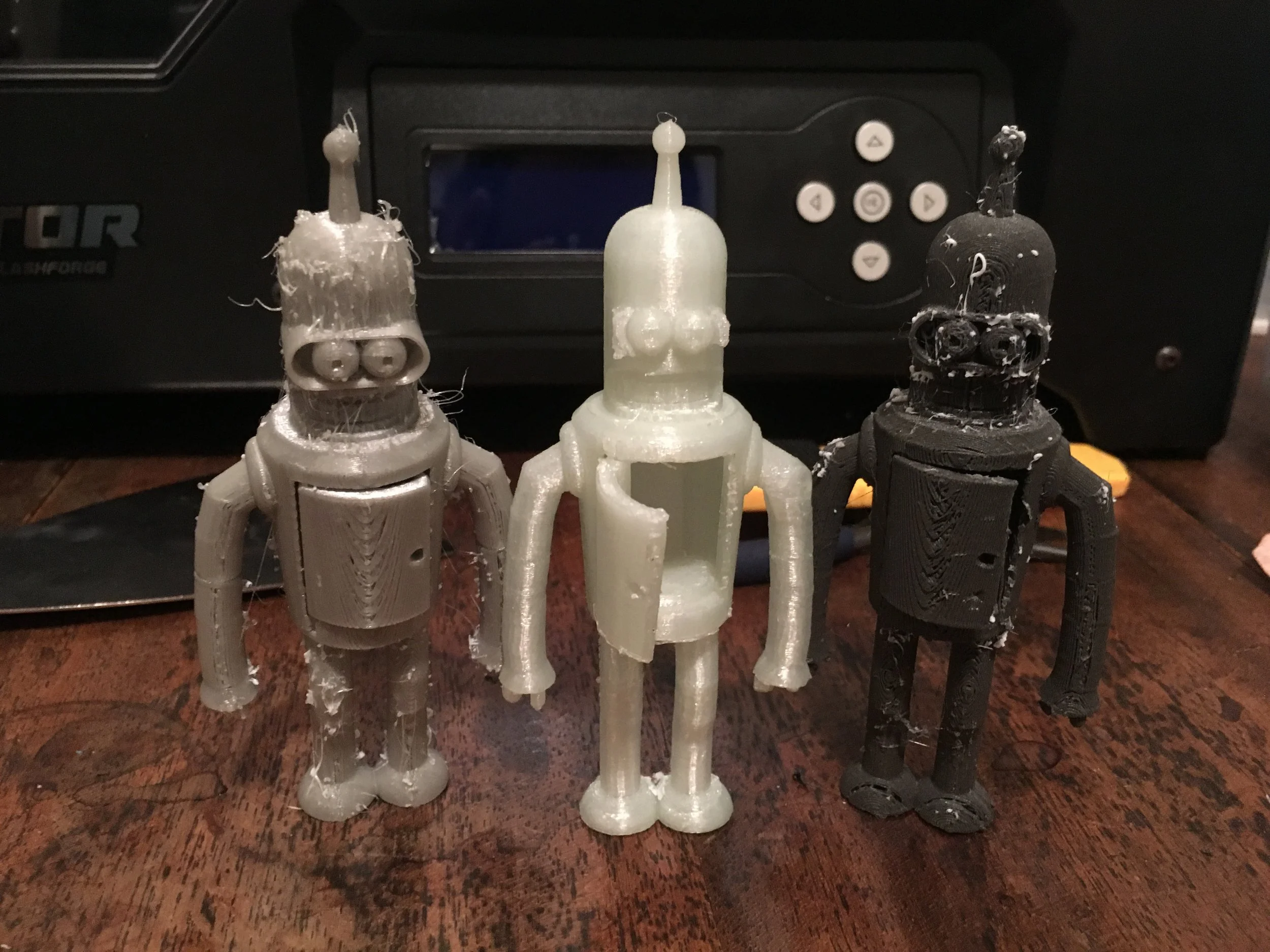 This was an experiment in creating a print in place hinge and using different materials for the same model. I printed Benders in wood PLA, iron PLA, glow in the dark PLA, and flexible TPU.