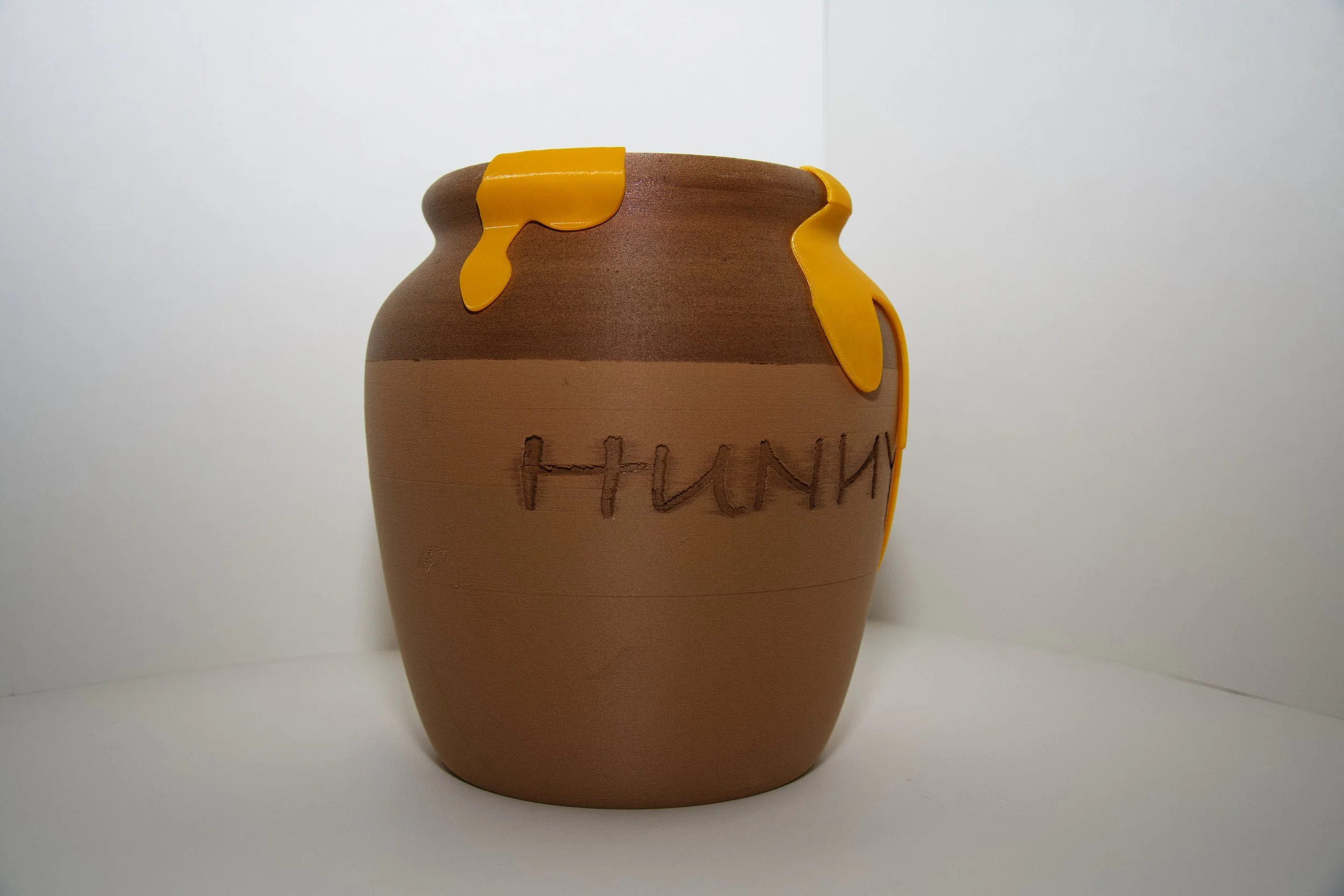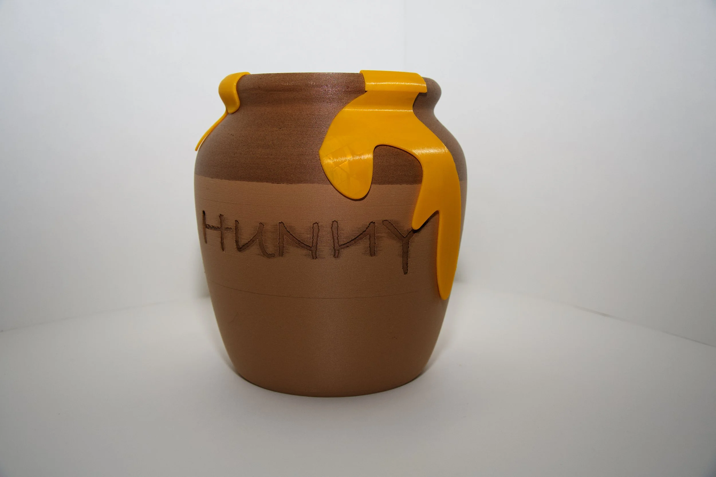 This “Hunny” Pot is made of wood fiber PLA. I used a wood stain pen to color the top of the pot and it worked really well. The spilled honey clips on and off and can be moved to different positions.